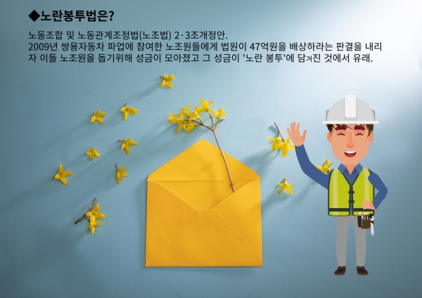 노란봉투법은 **「노동조합 및 노동관계조정법 일부개정안」**으로, 노동자의 단체행동권을 실질적으로 보장하고, 기업의 손해배상 남용을 제한하기 위한 법적 장치입니다. ‘노란봉투’라는 이름은 2014년 쌍용자동차 해고 노동자를 돕기 위해 시민들이 성금을 담아 전달한 캠페인에서 유래하며, 사회적 연대와 노동자 보호의 상징으로 자리잡았습니다.