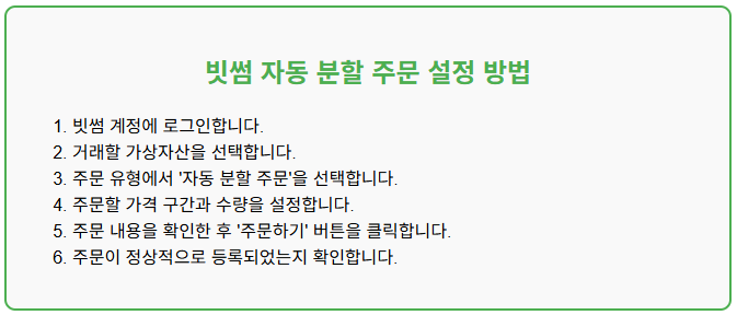 자동 분할 주문은 주식 시장에서 사용된 기능으로, 국내 가상자산 거래소 중 빗썸이 가장 먼저 도입 했습니다.