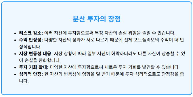 • 이러한 장점들 덕분에 분산 투자는 많은 투자자들에게 선호되는 전략입니다.