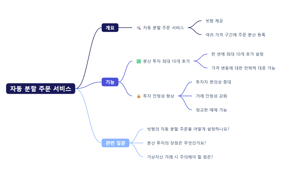 자동 분할 주문은 이용자가 특정 코인에 대해 한 번에 여러 호가(가격대)에 최대 10개까지 주문을 등록할 수 있도록 지원한다. 매수 주문은 설정한 조건을 기준으로 낮은 가격에, 매도 주문은 높은 가격으로 분할 주문된다. 이후 시장 가격이 해당 구간에 도달하면 거래가 이뤄지며, 체결되지 않은 주문은 유지되거나 개별 취소할 수 있다.