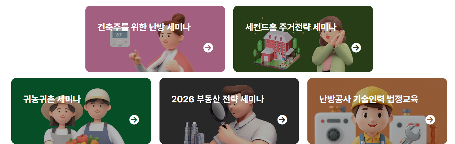 - 설명: 박람회 기간 동안 진행되는 모든 세미나를 한눈에 볼 수 있는 종합 안내입니다. 분야별로 다양한 주제를 다루며, 건축·부동산·난방·귀농 등 실생활과 밀접한 정보가 제공됩니다.